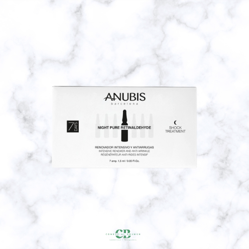 Anubis 7 Days Shock Treatment Night Pure Retinaldehyde 7×1.5ml es un tratamiento de uso nocturno formulado para proporcionar una renovación celular intensa mientras duermes. Gracias al Retinaldehído, una de las formas más efectivas y estables del Retinol, actúa en profundidad sobre las arrugas, la falta de firmeza y la pérdida de elasticidad, transformando visiblemente la piel.