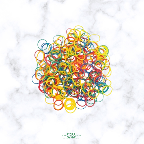 Gomas elásticas de colores de gran resistencia. Bolsa de 100 gramos. Es ideal para trenzas africanas.